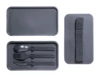 Pudełko śniadaniowe z tworzywa PP z zestawem sztućców (widelec, łyżka i nóż) i elastycznym paskiem. Z 2 przegródkami o pojemności 700 ml każda.