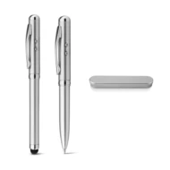 Wielofunkcyjny metalowy długopis z klipsem. Długopis z mini latarką LED, wskaźnikiem laserowym i końcówką dotykową. Zawiera 3 baterie LR41. Niebieski tusz. Dostarczany w metalowym etui. ø10 x 125 mm | Pudełko: 178 x 38 x 19 mm