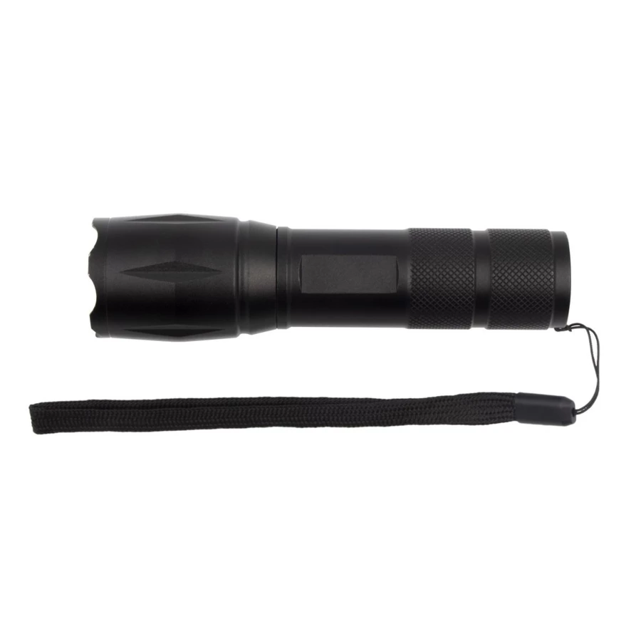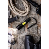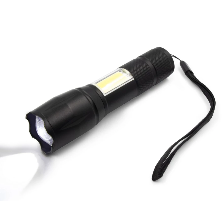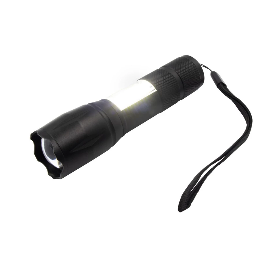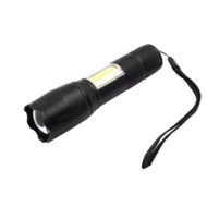 Latarka 1 LED 5W (280 lumenów), z bocznym światłem COB 3W, przycisk ON/OFF, wejście micro USB, ładowana przez USB, 4 tryby świecenia, bateria 1200 mAh, ok. 4h pracy na jednym naładowaniu, pasek na rękę, kabel micro USB w komplecie