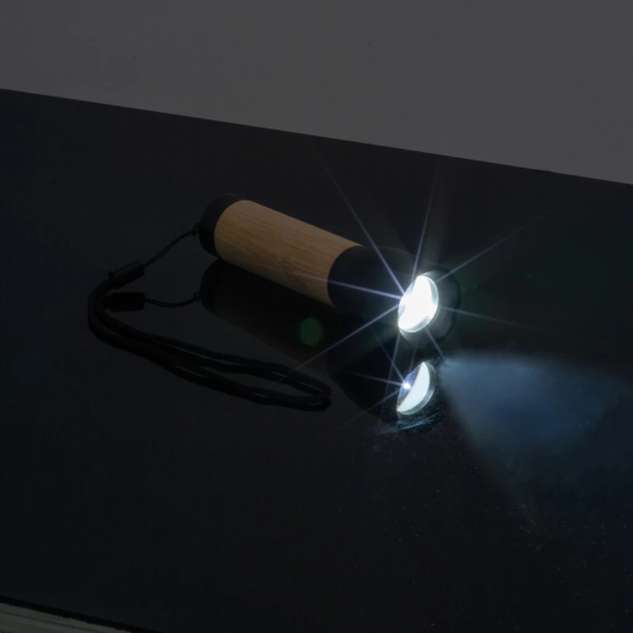 Kieszonkowa latarka, wykonana z aluminium pochodzącego z recyklingu, z bambusową strefą chwytu, o mocy 400 lumenów i baterią o pojemności 300 mAh. Kabelek do ładowania typu C, dołączony do produktu.