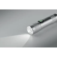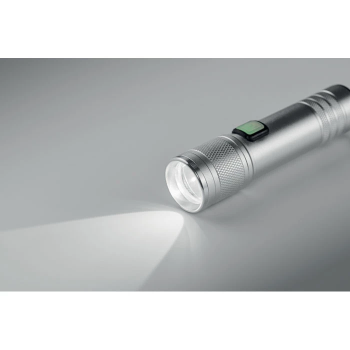 Latarka COB z możliwością ładowania, wykonana z aluminium pochodzącego z recyklingu. 100 lumenów z 3 ustawieniami światła i funkcją zoom. Wbudowany akumulator o pojemności 800 mAh. Kabel do ładowania w zestawie.