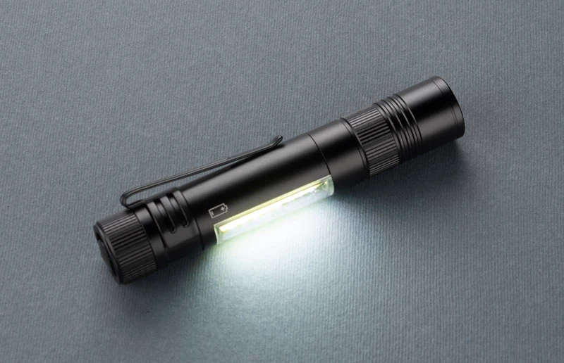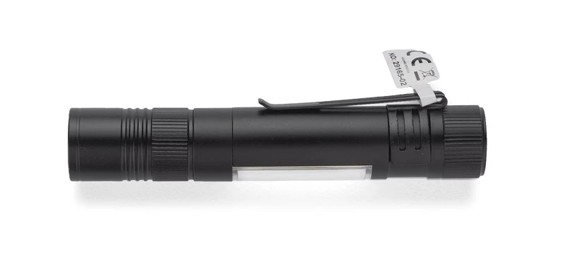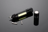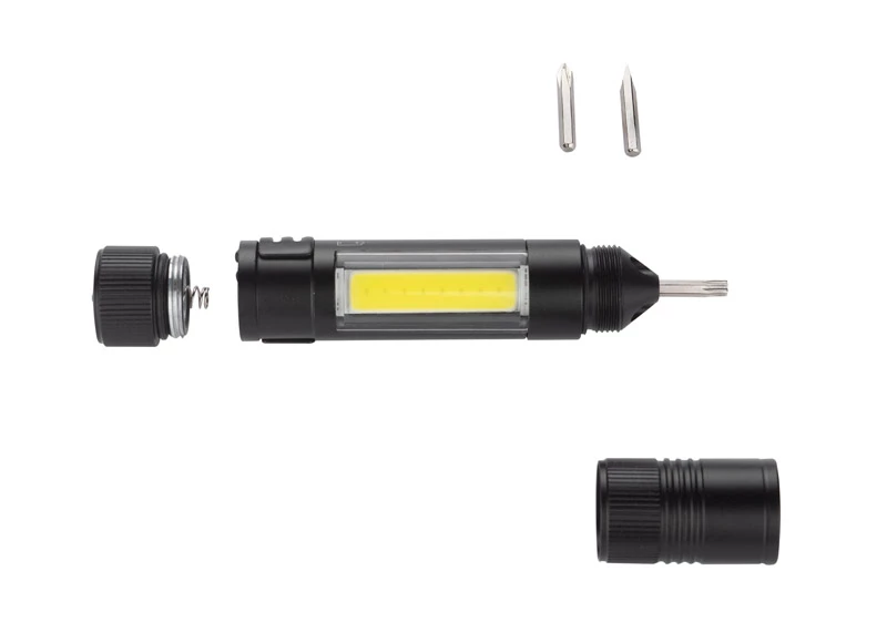 Latarka MAESTRO to gadżet wielofunkcyjny. Oprócz głównej funkcji, czyli lampki COB, w produkcie znajdziemy również zestaw trzech bitów: płaski, krzyżowy i gwiazdkowy. Latarka wyposażona jest w metalowy klip i magnes do mocowania.