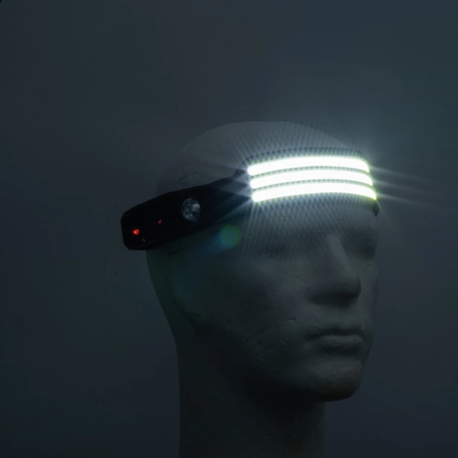 Czołówka o mocy 400 lumenów, z 3 diodami COB i żarówką 303 i kilkoma trybami świecenia. Czas świecenia na pełnym naładowaniu do 3h (bateria 800 mAh).