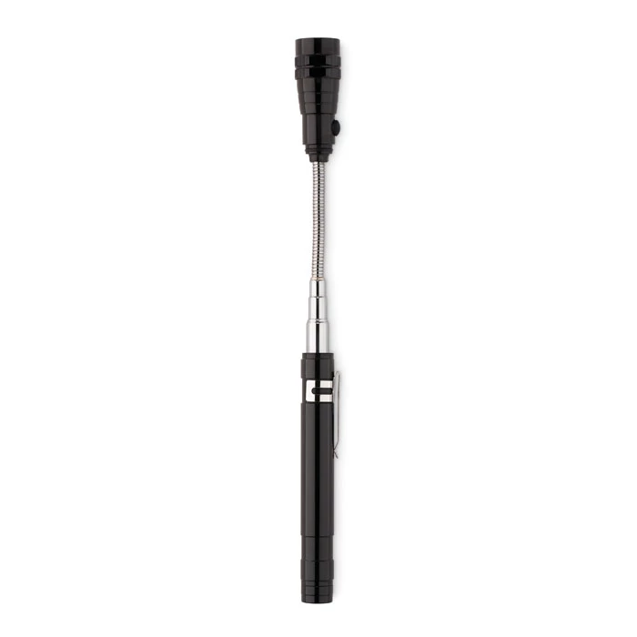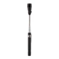 Teleskopowa, aluminiowa latarka z 3 diodami LED, magnesem na głowicy oraz klipem umieszczonym z boku. Max. dł. 57cm. Dołączone 4 baterie LR44.