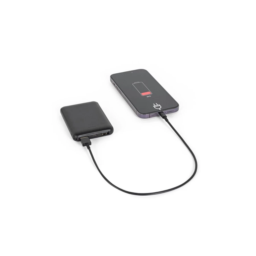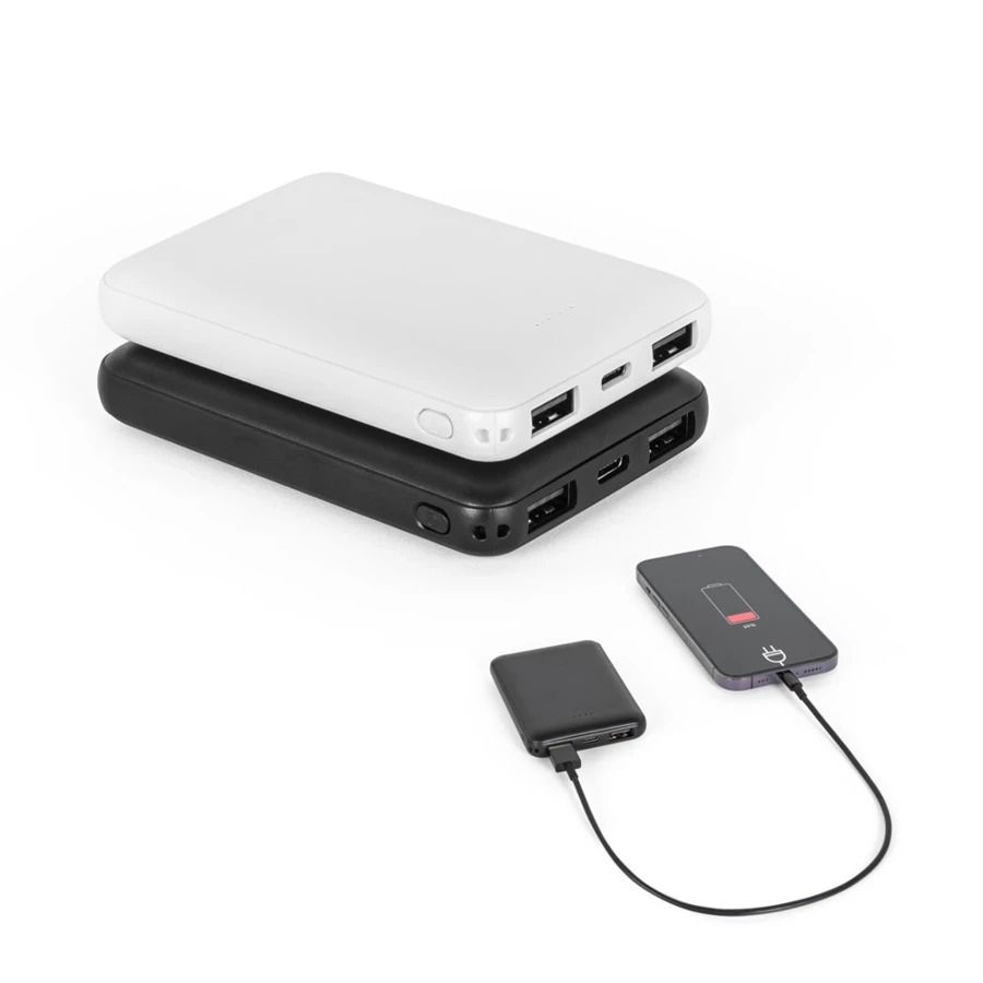 Power bank z wskaźnikiem poziomu naładowania, przydatny, aby zawsze mieć dodatkową moc baterii, gdy jej potrzebujesz.Materiał: przetworzony ABS (100% rABS)Pojemność: 5000 mAhWejście: microUSB, USB-C (10 W)Wyjście: USB-C, 2 x USB-A (12 W)Funkcje: umożliwia jednoczesne ładowanie 3 urządzeńZawartość: kabel USB-A / USB-COpakowanie: pudełko prezentowe z przetworzonego papieru pakowego.Wymiary: 91 x 63 x 15 mm | Box: 75 x 115 x 18 mm