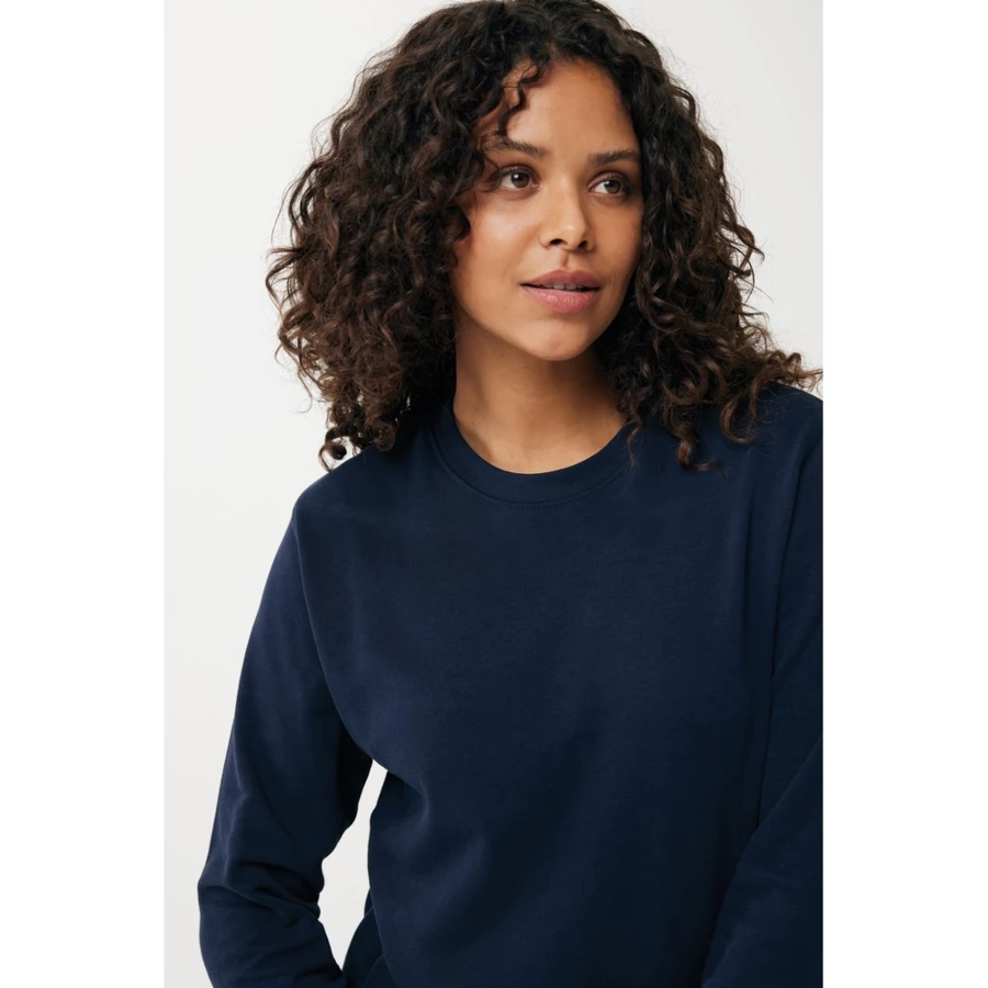 Lekki sweter, unisex, regularny krój, okrągły dekolt, długie rękawy, wykonana w 30% z bawełny z recyklingu i w 70% z bawełny organicznej o gramaturze 280 g/m2, posiada wbudowany znacznik AWARE™, który potwierdza wykorzystanie materiałów z recyklingu, posiada kod QR na metce, który prowadzi do cyfrowego paszportu produktu, 2% wpływów z każdego sprzedanego produktu z kolekcji Impact jest przekazywane na rzecz Water.org, ślad węglowy produktu: 7,04 kg CO2