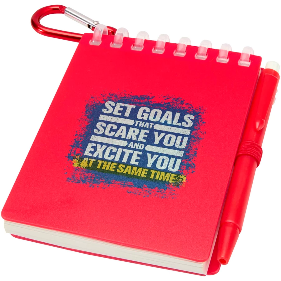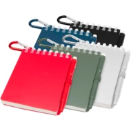 Lig zestaw mini notatnika oraz długopisu to kompaktowe i praktyczne rozwiązanie do robienia notatek w podróży. Notatnik w oprawie spiralnej ma miękką okładkę z recyklingowanego plastiku i 70 czystych kartek z papieru kamiennego o gramaturze 120 g/m², odpornego na działanie wody, dzięki czemu idealnie nadaje się do użytku na zewnątrz. Dzięki zaokrąglonym narożnikom i wbudowanej pętelce na długopis wpisuje się w trend miniaturyzacji, zachowując jednocześnie funkcjonalność. Dopasowany długopis jest wykonany z plastiku ABS z recyklingu, ma czarny tusz i oferuje długość pisania 250 metrów. Metalowy pierścień w dopasowanym kolorze umożliwia łatwe przymocowanie zestawu do plecaka, torebki lub łańcucha do kluczy, dzięki czemu idealnie nadaje się do sporządzania trwałych notatek w dowolnym miejscu. Rozmiar notatnika: 11 x 7,5 cm.