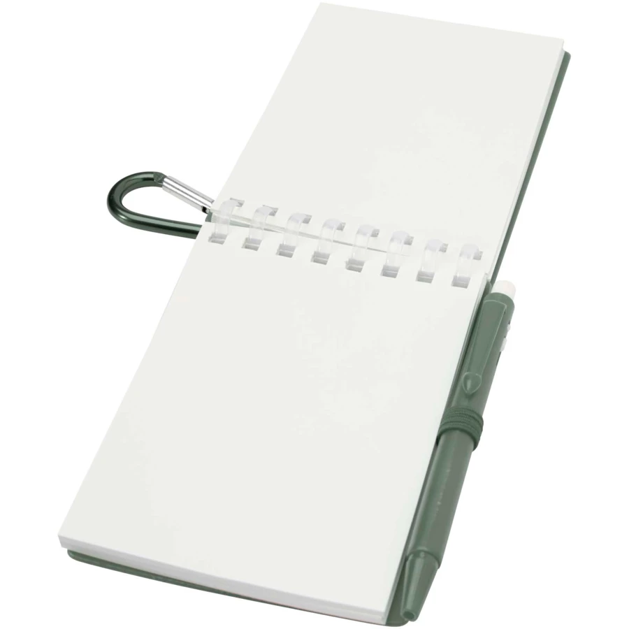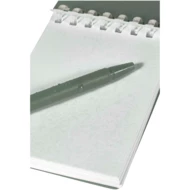 Lig zestaw mini notatnika oraz długopisu to kompaktowe i praktyczne rozwiązanie do robienia notatek w podróży. Notatnik w oprawie spiralnej ma miękką okładkę z recyklingowanego plastiku i 70 czystych kartek z papieru kamiennego o gramaturze 120 g/m², odpornego na działanie wody, dzięki czemu idealnie nadaje się do użytku na zewnątrz. Dzięki zaokrąglonym narożnikom i wbudowanej pętelce na długopis wpisuje się w trend miniaturyzacji, zachowując jednocześnie funkcjonalność. Dopasowany długopis jest wykonany z plastiku ABS z recyklingu, ma czarny tusz i oferuje długość pisania 250 metrów. Metalowy pierścień w dopasowanym kolorze umożliwia łatwe przymocowanie zestawu do plecaka, torebki lub łańcucha do kluczy, dzięki czemu idealnie nadaje się do sporządzania trwałych notatek w dowolnym miejscu. Rozmiar notatnika: 11 x 7,5 cm.