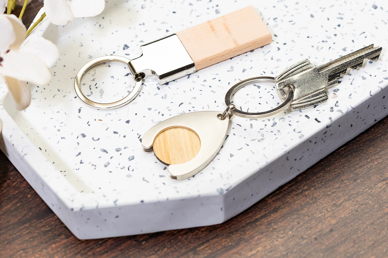 Brelok do kluczy w kształcie prostokąta, wykonany z metalu i drewna bukowego, z metalowym kółkiem.