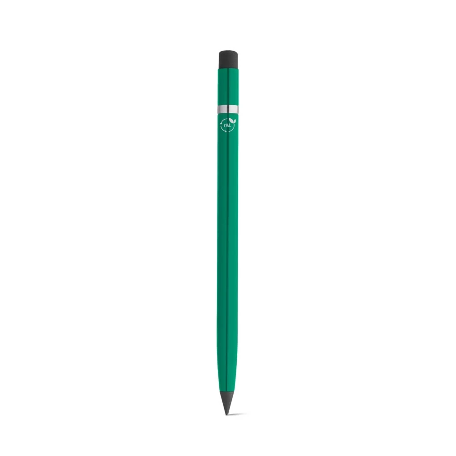 Ołówek z korpusem z aluminium pochodzącego z recyklingu (100% rAL) oraz elementami z PE, z końcówką grafitową. Przeznaczony do długotrwałego użytkowania bez potrzeby ostrzenia. Na końcu znajduje się gumka, która umożliwia łatwe ścieranie napisów. ø8 x 150 mm
