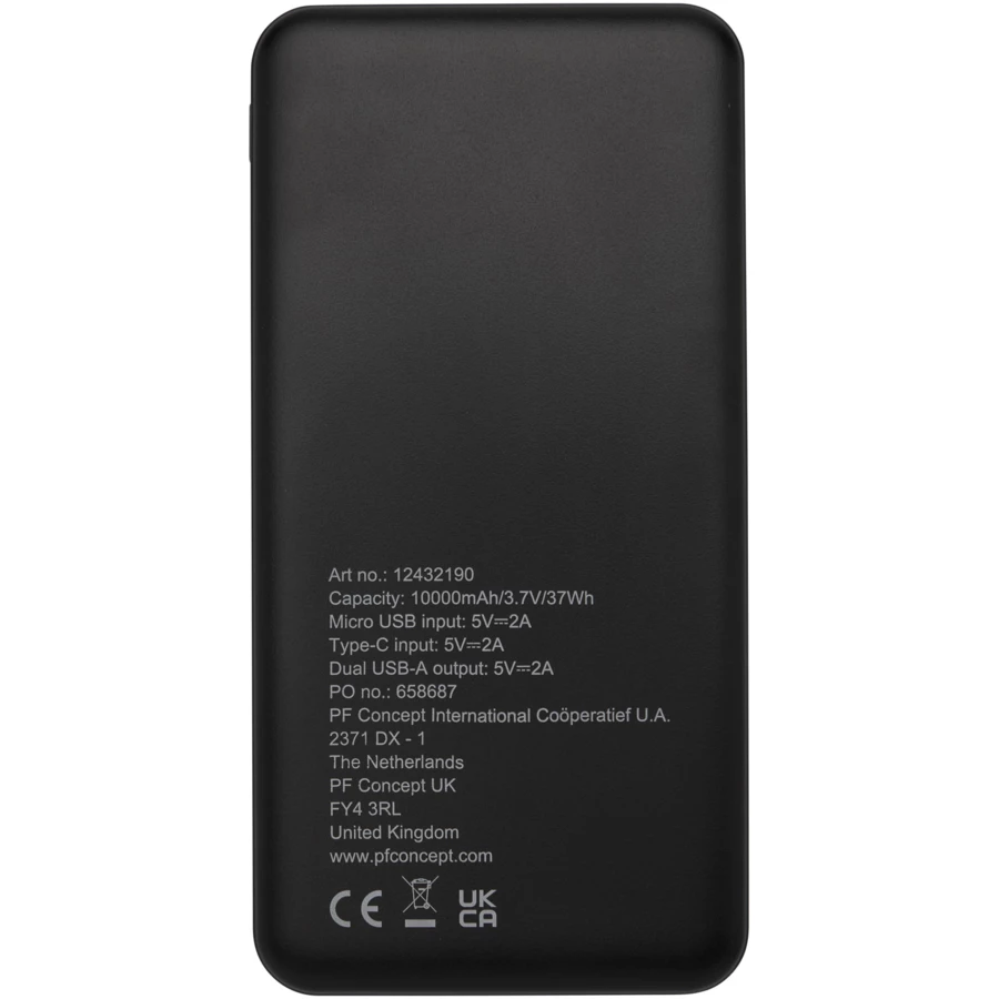 Powerbank wykonany z plastiku ABS pochodzącego z recyklingu. Powerbank zawiera wytrzymałą baterię litowo-polimerową klasy A o pojemności 10 000 mAh, która zapewnia szybkie ładowanie. Wskaźniki zasilania wskazują pozostały poziom energii, dzięki czemu zawsze wiesz, kiedy należy naładować urządzenie. Wejście typu C 5 V/2 A, wejście Micro USB 5 V/2 A, podwójne wyjście USB-A 5 V/2 A, całkowita moc 10 W. Dostarczany z 30-centymetrowym kablem ładującym TPE 2A USB-A do USB typu C, instrukcją obsługi i pudełkiem upominkowym z papieru Kraft.