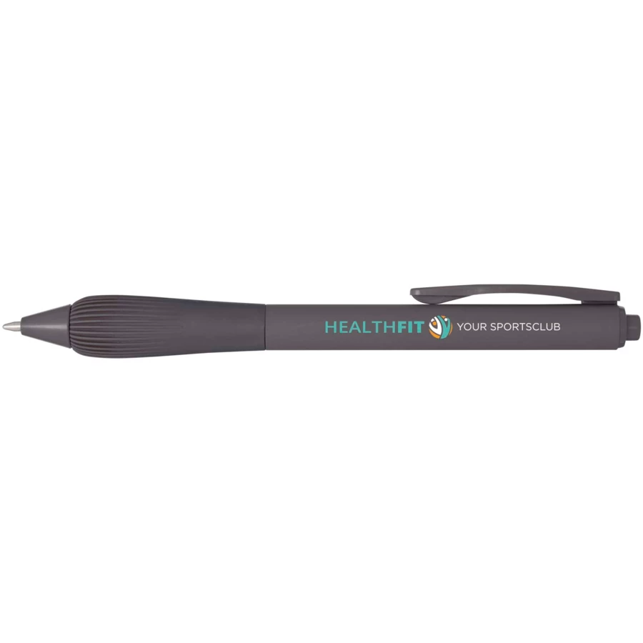 Długopis z tworzyw sztucznych pochodzących z recyklingu, z gumowanym korpusem i uchwytem wykonanym z TPR. Kolor tuszu: Czarny. Żywotność: 1000 metrów. Rozmiar stalówki: 1,0 mm.