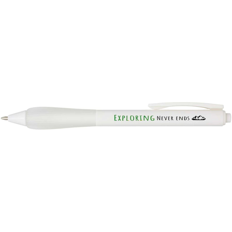 Długopis z tworzyw sztucznych pochodzących z recyklingu, z gumowanym korpusem i uchwytem wykonanym z TPR. Kolor tuszu: Niebieski. Żywotność: 1000 metrów. Rozmiar stalówki: 1,0 mm.