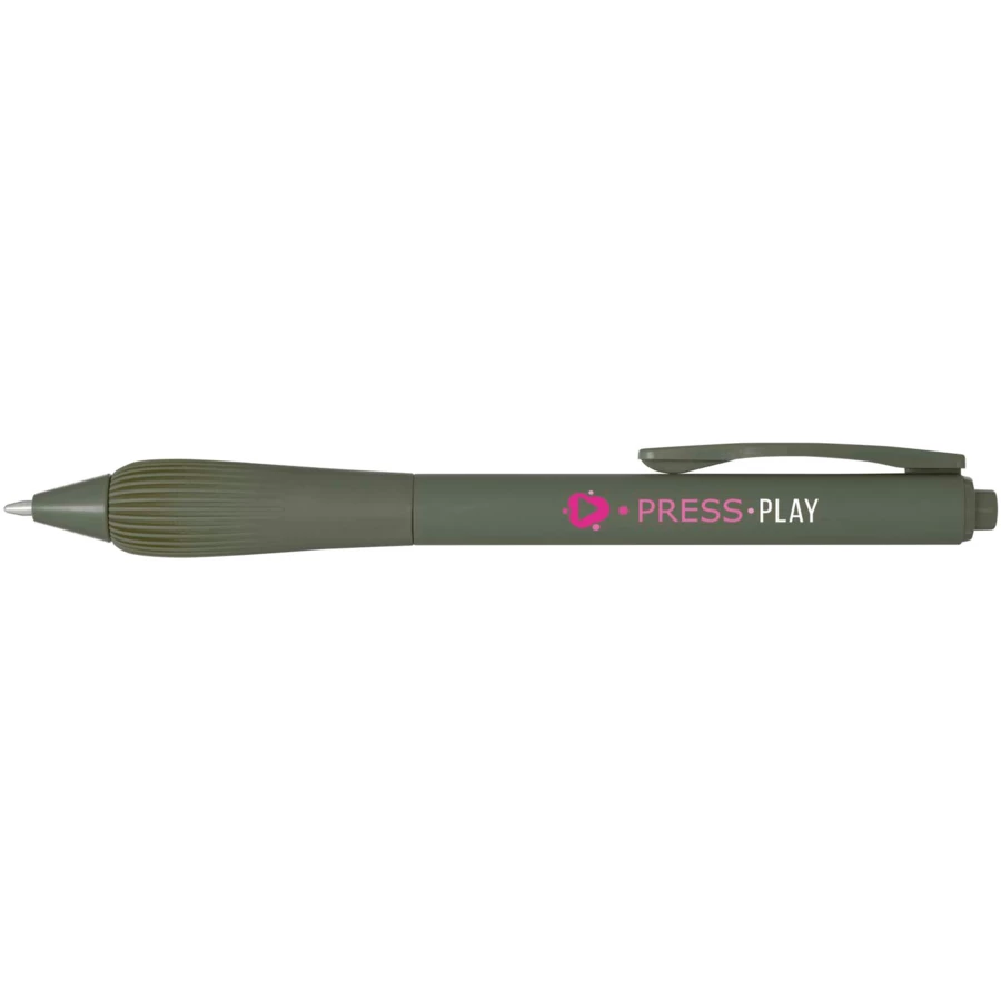 Długopis z tworzyw sztucznych pochodzących z recyklingu, z gumowanym korpusem i uchwytem wykonanym z TPR. Kolor tuszu: Niebieski. Żywotność: 1000 metrów. Rozmiar stalówki: 1,0 mm.
