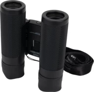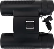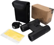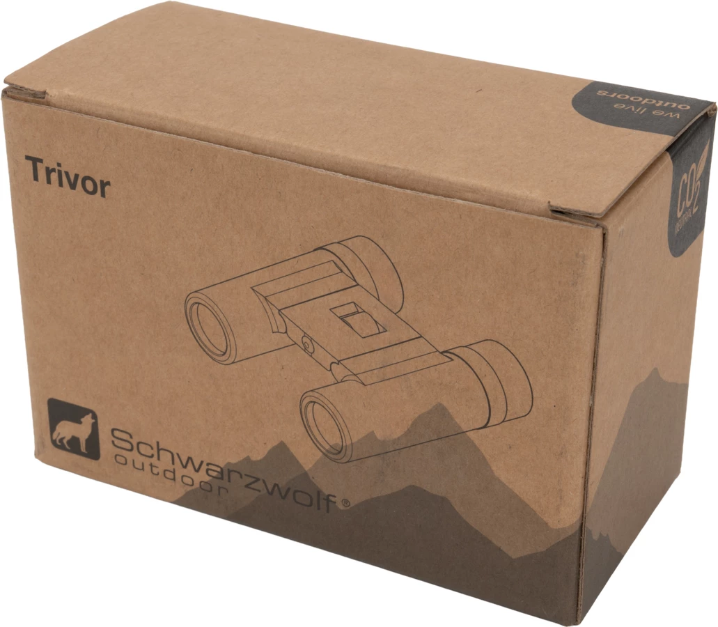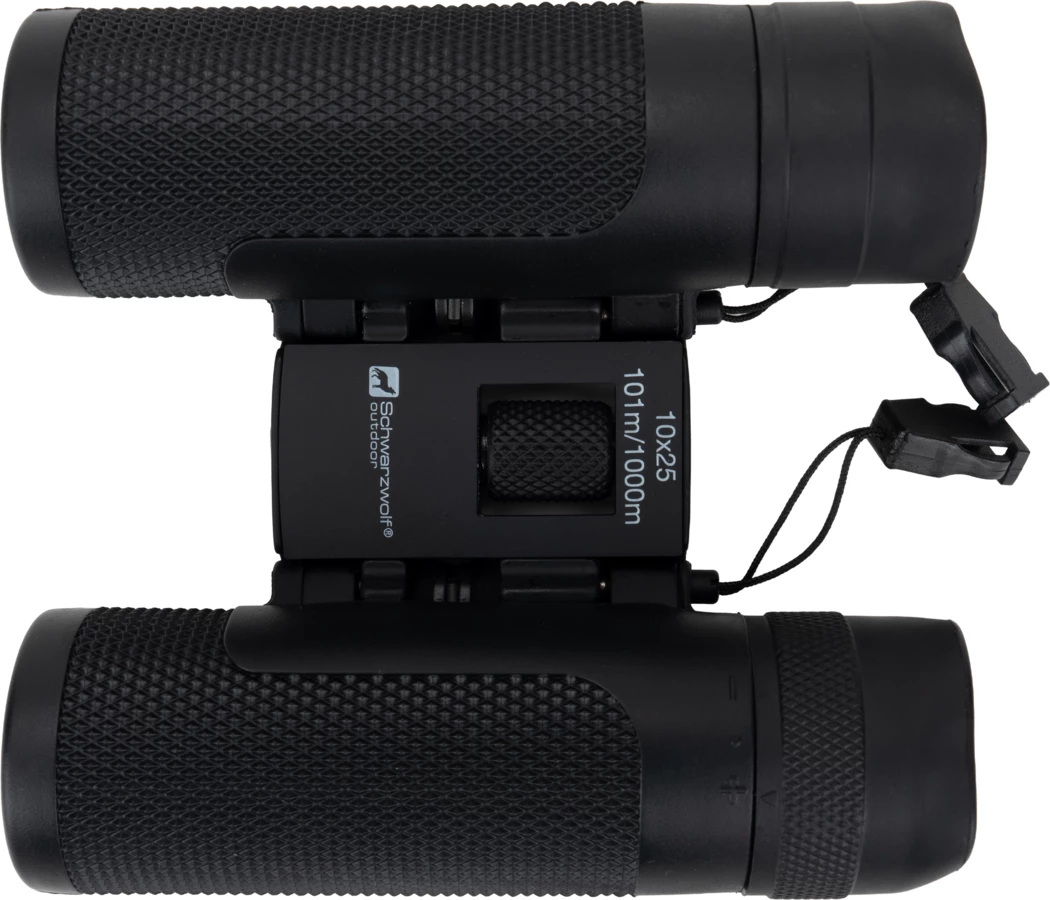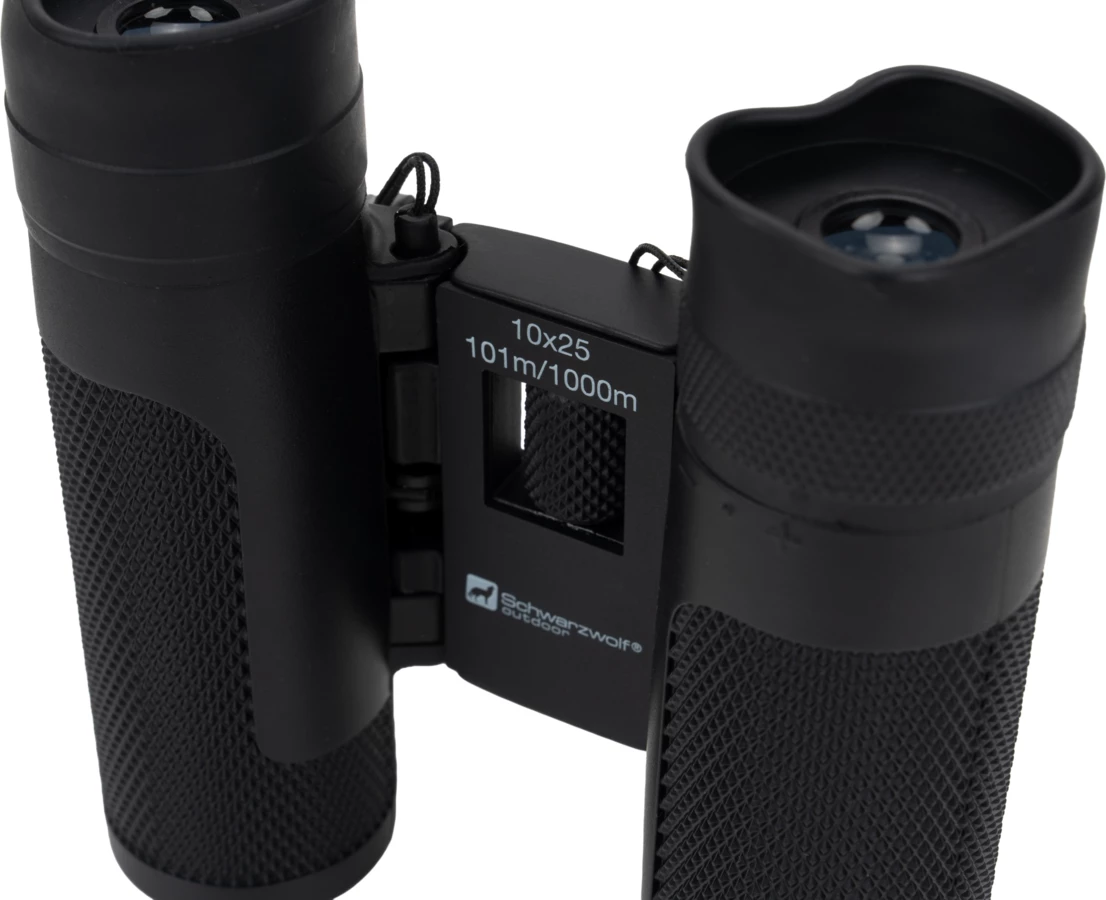 Lornetka Schwarzwolf o powiększeniu 10x i średnicy obiektywu 25mm, pole widzenia na 1000 m: 101 m, kąt widzenia 5,8°, średnia źrenica wyjściowa to 11 mm, minimalna odległość ostrzenia to 3 m. Lornetka zapakowana w neoprenowy futerał z paskiem na szyję.