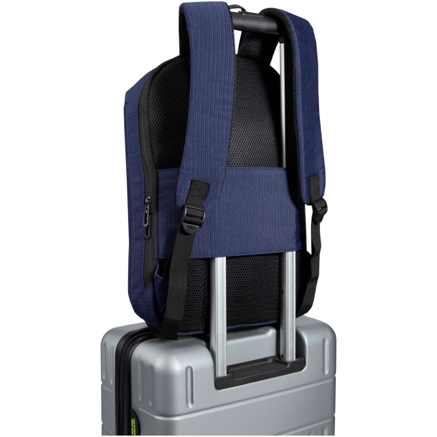Wykonany z poliestru żakardowego z recyklingu z podszewką z RPET w pasującym kolorze, plecak antykradzieżowy Luma na laptopa z ekranem o przekątnej 15 cali łączy w sobie inteligentne zabezpieczenia z eleganckim stylem dla osób będących w ciągłym ruchu. Funkcje zabezpieczające przed kradzieżą obejmują zamki błyskawiczne z możliwością zamknięcia (kłódka nie jest dołączona) i ukrytą tylną kieszeń, która może służyć również jako pasek do mocowania plecaka do wózka. Materiał jest również wodoodporny i chroni zawartość plecaka przed lekkim deszczem. Wewnątrz znajduje się wyściełana komora na laptopa z ekranem o przekątnej do 15 cali, dedykowana kieszeń na tablet, otwarta kieszeń z uchwytem na długopis oraz przemyślane schowki, które pozwalają uporządkować niezbędne akcesoria. Plecak posiada również wyściełane paski naramienne, oddychający panel tylny oraz metalowe płytki z przodu. Niezależnie od tego, czy do pracy jedziesz rowerem, czy poruszasz się po zatłoczonym lotnisku, czy wybierasz się na zajęcia, plecak Luma zapewni Ci komfort i styl przez cały dzień.