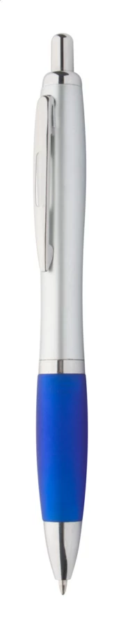 Plastikowy długopis z kolorowym gumowym uchwytem z niebieskim wkładem.