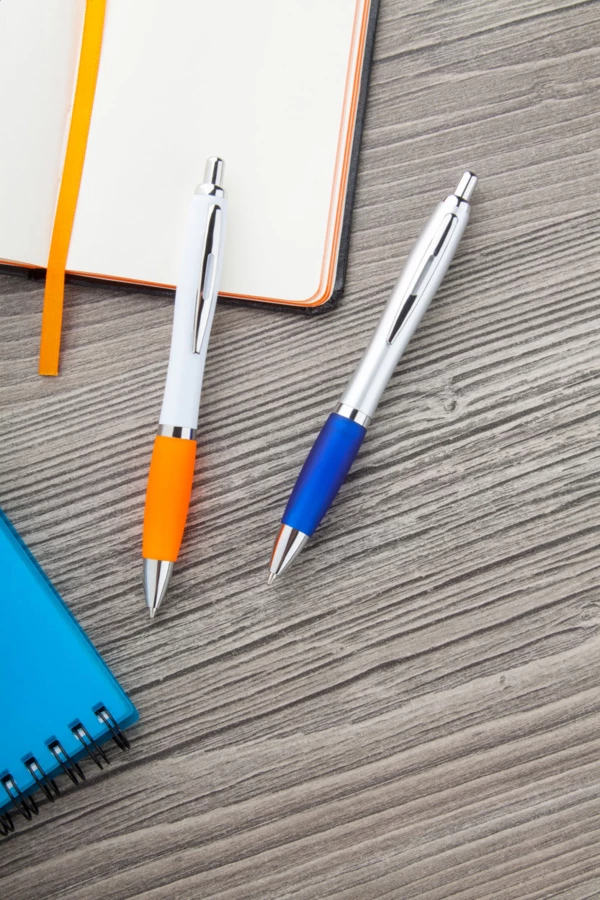 Plastikowy długopis z kolorowym gumowym uchwytem z niebieskim wkładem.