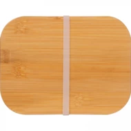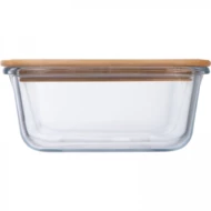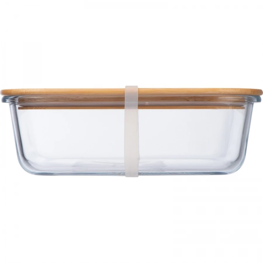 Pudełko wykonane ze szkła borokrzemianowego, z pokrywką z bambusa i elastycznym silikonowym paskiem do zamykania, o pojemności 1000 ml.