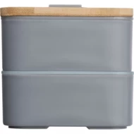 Dwupoziomowe pudełko na lunch z dwiema osobnymi przegrodami (obie z własną przykrywką), bambusową pokrywką i przekładką (do oddzielania poszczególnych części posiłku w obrębie jednej przegrody). Bambusową pokrywkę można wykorzystać jako deseczkę do krojenia lub outdoorowy talerzyk. W zestawie znajdziemy również nóż, widelec, łyżkę oraz szeroką gumkę, zespajającą wszystkie elementy tego pudełka śniadaniowego.