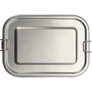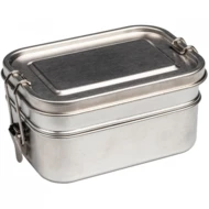 Dwupoziomy, metalowy lunch box, szczelnie zamykany, wykonany ze stali nierdzewnej. Dostępny w naturalnym szarym kolorze.