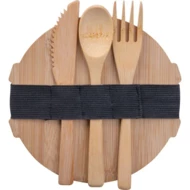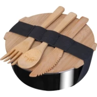 Metalowy lunchbox o pojemności 700 ml, z bambusową pokrywką do której za pomocą gumki zamocowany jest komplet bambusowych sztućców - łyżka, nóż i widelec.