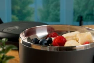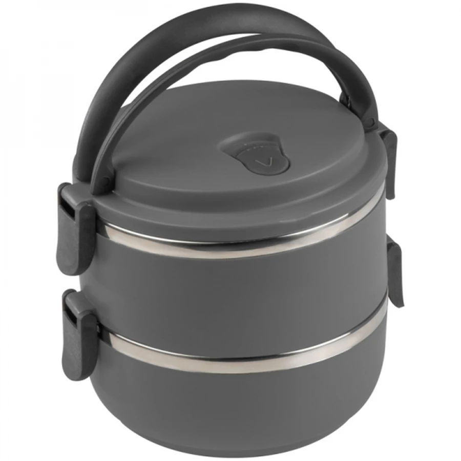 Lunch box wykonany ze stali nierdzewnej. Posiada dwie oddzielne przegrody i uchwyt do noszenia.
