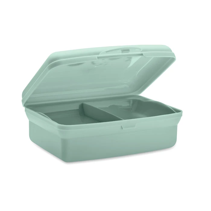 Pojemnik na lunch dla dzieci z PP pochodzącego, z zamknięciem na zatrzask i wewnętrzną tacką. Pojemność: 700 ml.