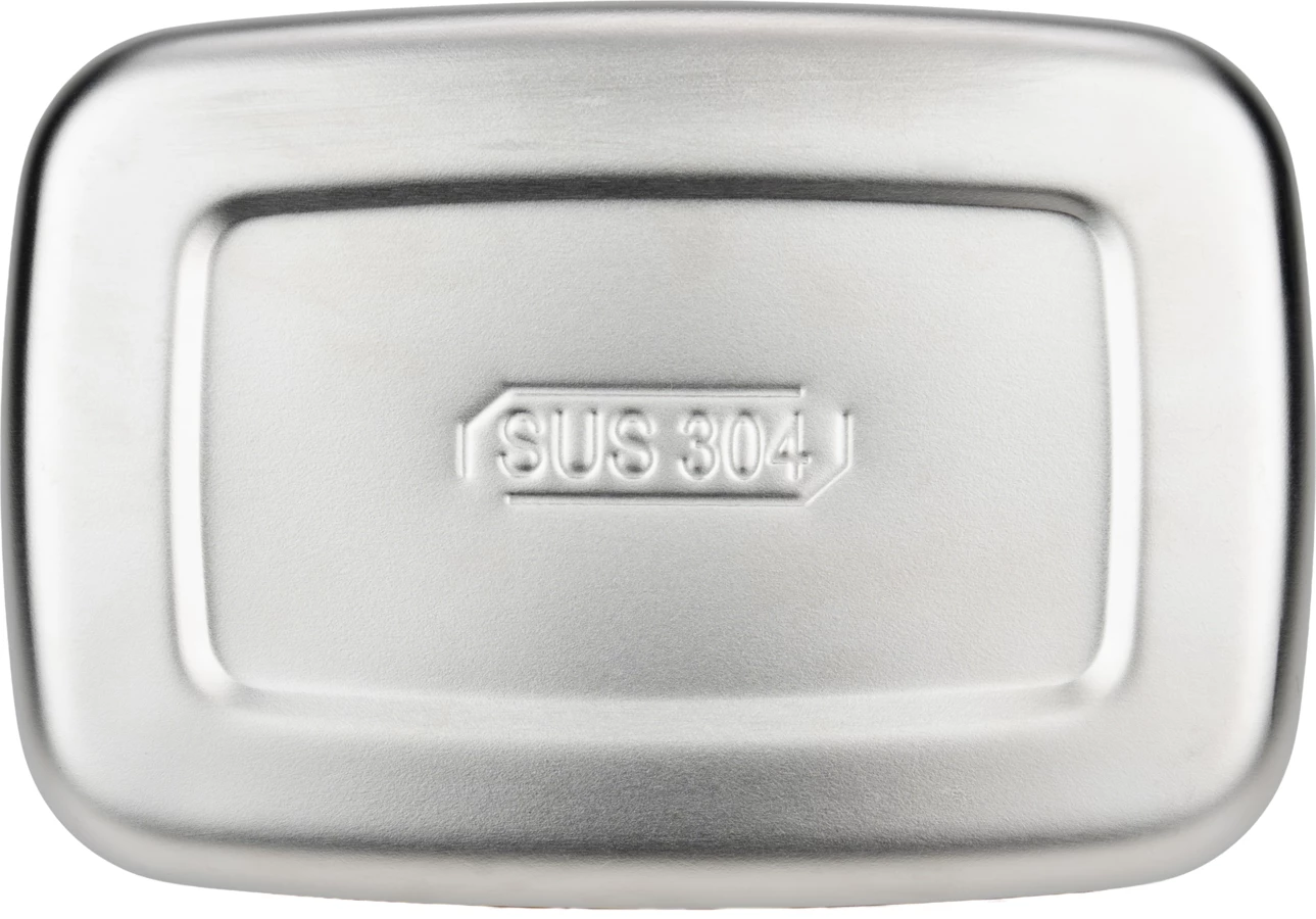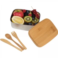 Pudełko śniadaniowe ze stali nierdzewnej z bambusowym wieczkiem, bambusowymi sztućcami i silikonowym paskiem do zamknięcia. Pudełko w kolorze beżowym.
