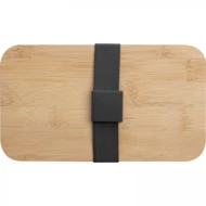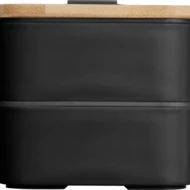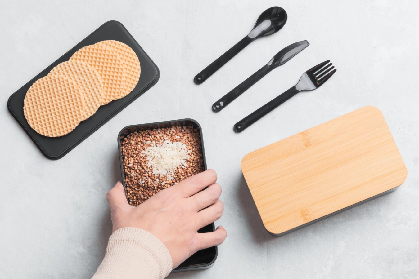 Zestaw z bambusa i plastiku, na który składają się: pudełko z dwiema osobnymi komorami (każda z własną przykrywką), bambusowa pokrywka (która służy też jako deska do krojenia lub outdoorowy talerz), przekładka (do oddzielania poszczególnych części posiłku w obrębie jednej przegrody) oraz nóż, widelec, łyżka i szeroka gumka do zamykania pudełka.