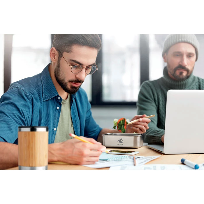 Lunchbox ze stali nierdzewnej z bambusową pokrywką i 2 sztućcami z dołączanym paskiem. Pojemność 600 ml. Bambus jest produktem naturalnym, mogą występować niewielkie różnice w kolorze i rozmiarze.