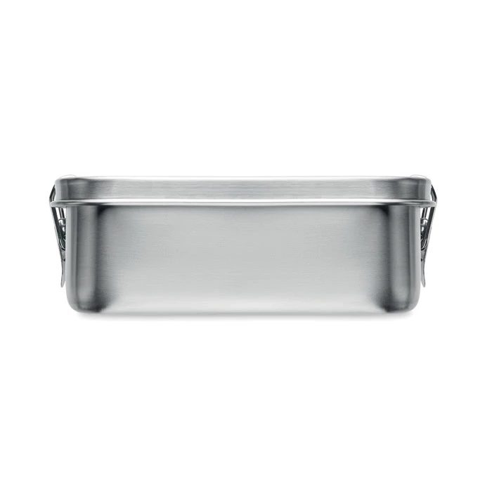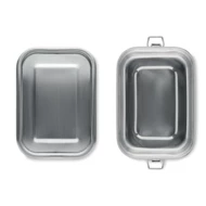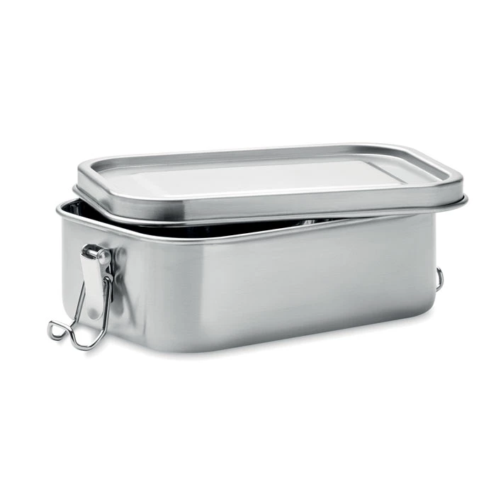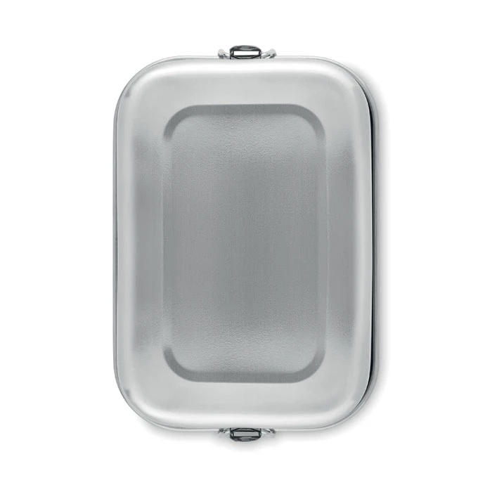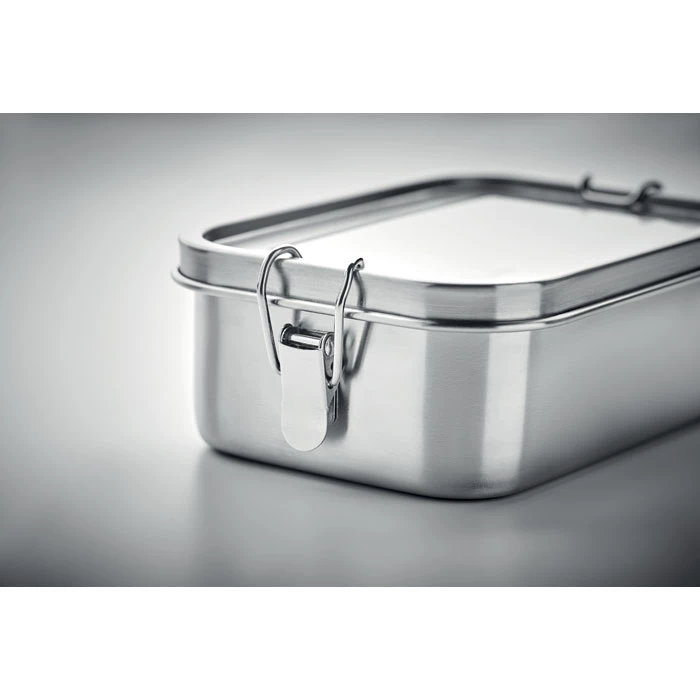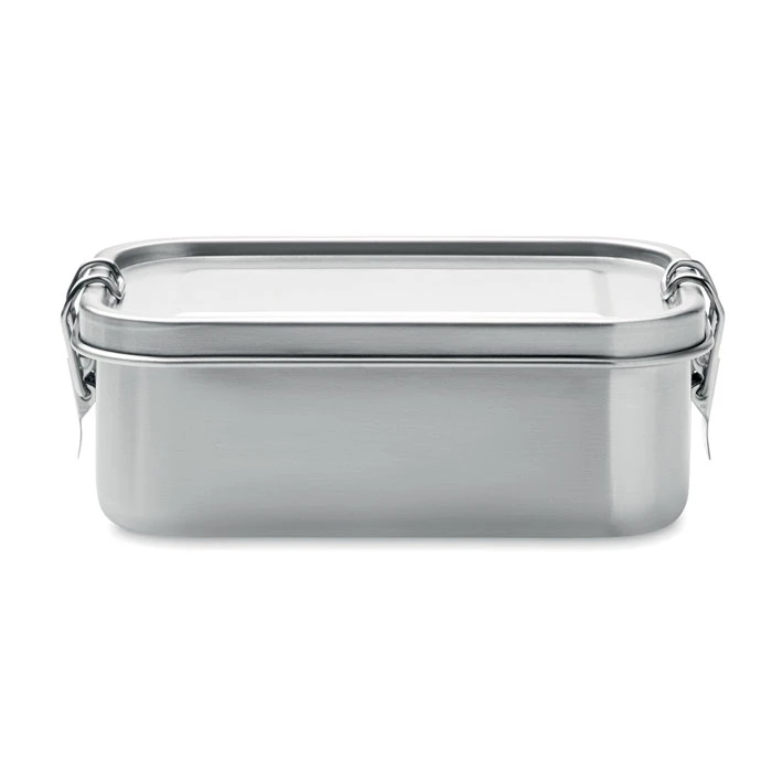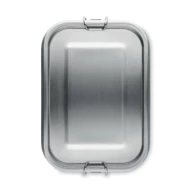 Lunchbox z recyklingowanej stali nierdzewnej (90% stali nierdzewnej z recyklingu i 10% stali nierdzewnej) z bezpiecznymi bocznymi klamrami i zaokrąglonymi rogami. Pojemność: 750 ml.
