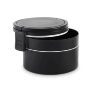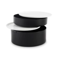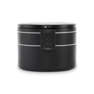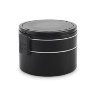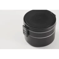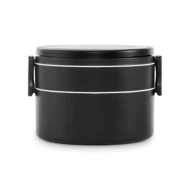 Dwupoziomowe okrągły lunchbox wykonane z PP z bocznym zamknięciem na zatrzask i uchwytami. Zawiera wewnętrzne pokrywki. Pojemność 250 ml na górze, 700 ml na dole.