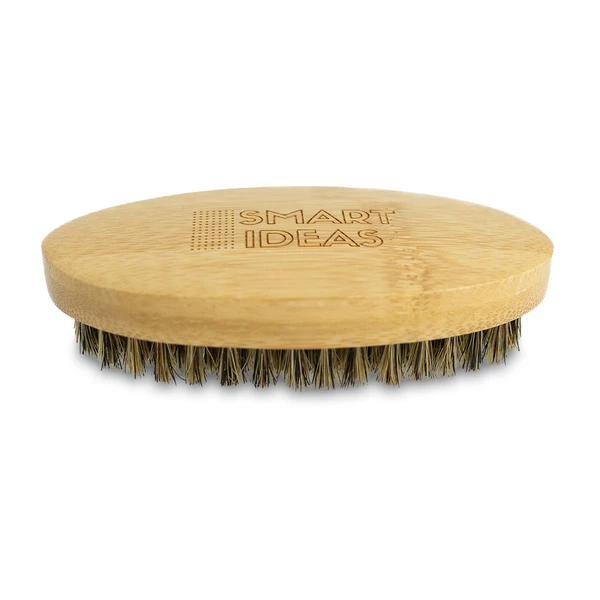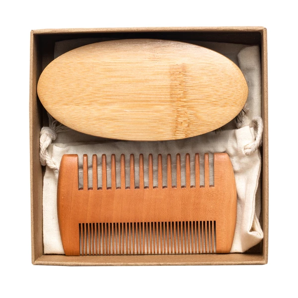 3-częściowy zestaw do pielęgnacji: szczotka do brody, grzebień oraz bawełniany woreczek, zapakowane w tekturowe pudełko.