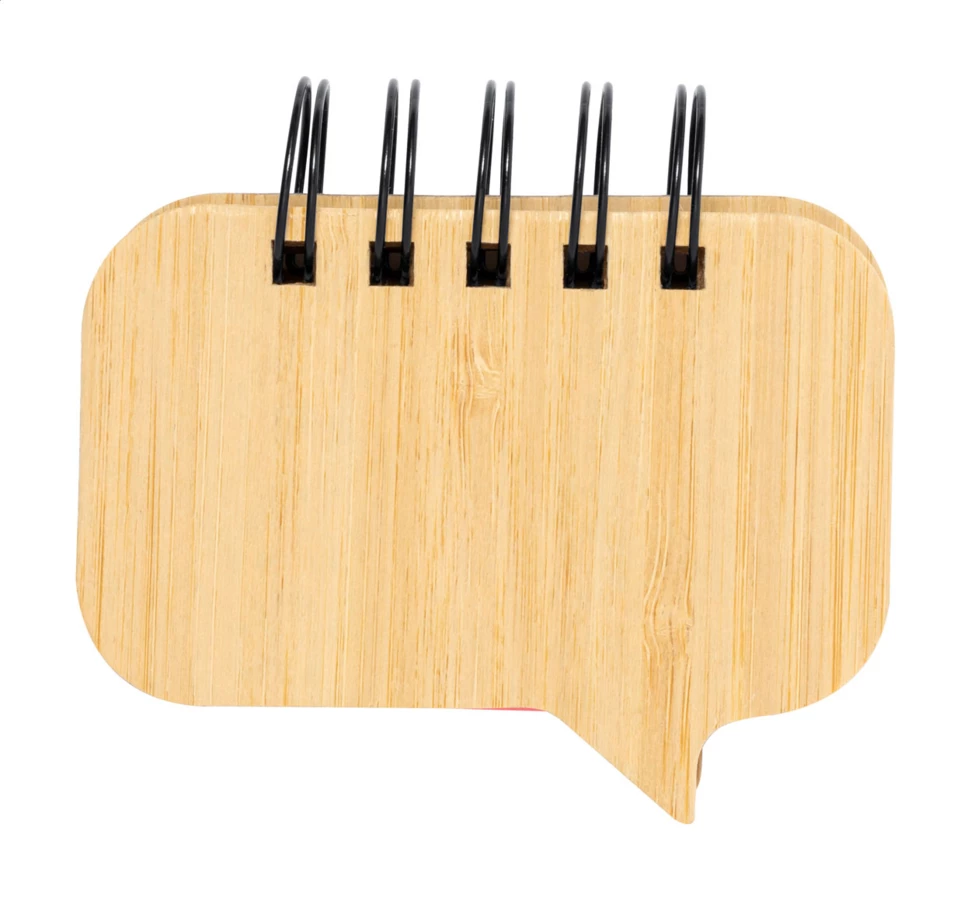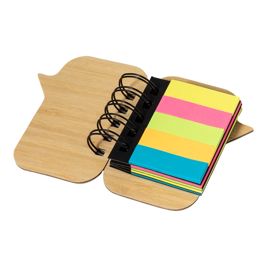 Notatnik spiralny, pokryty bambusem, zawierający 100 dużych karteczek samoprzylepnych (w 4 różnych kolorach) i 125 zakładek (w 5 różnych kolorach).