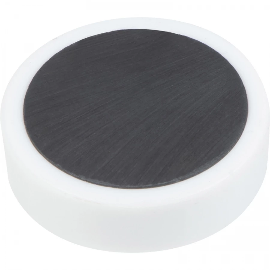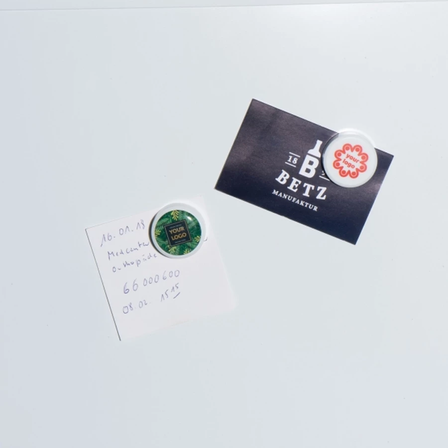 Magnes o średnicy 3 cm, wykonany z tworzywa sztucznego, zapewnia dużo miejsca na białej powierzchni do pełnego nadruku cyfrowego.