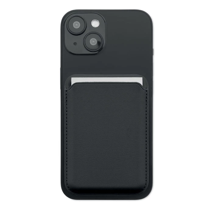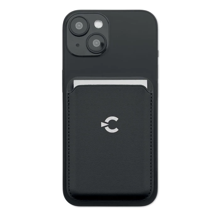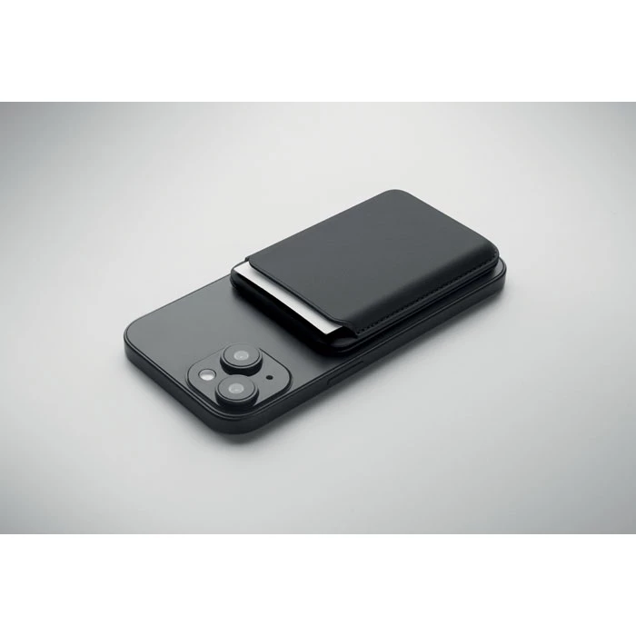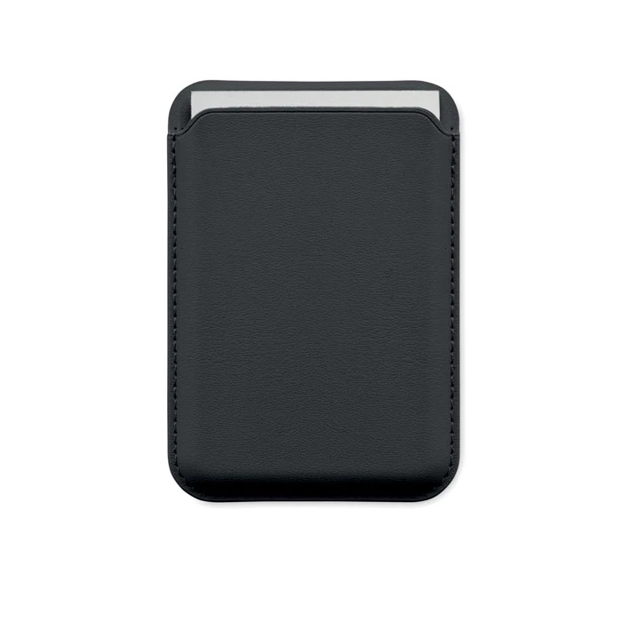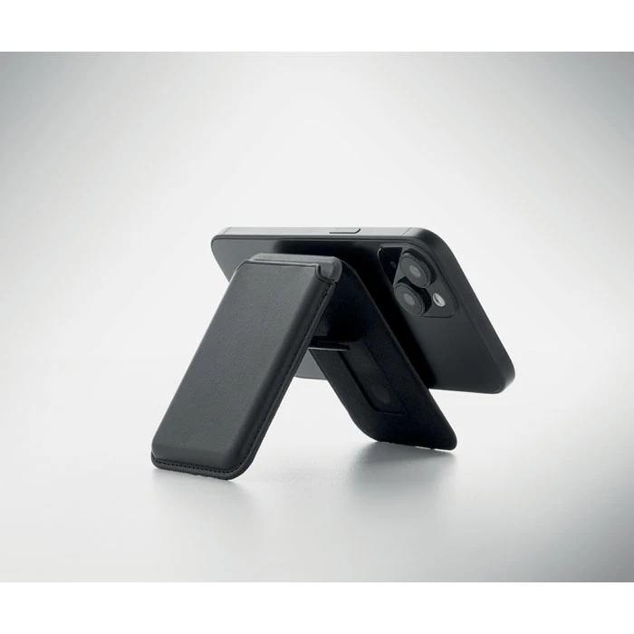 Magnetyczne etui na karty kredytowe ze skóry PU (na 3 karty) z funkcją podstawki. Zawiera dodatkowy metalowy pierścień.
