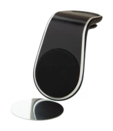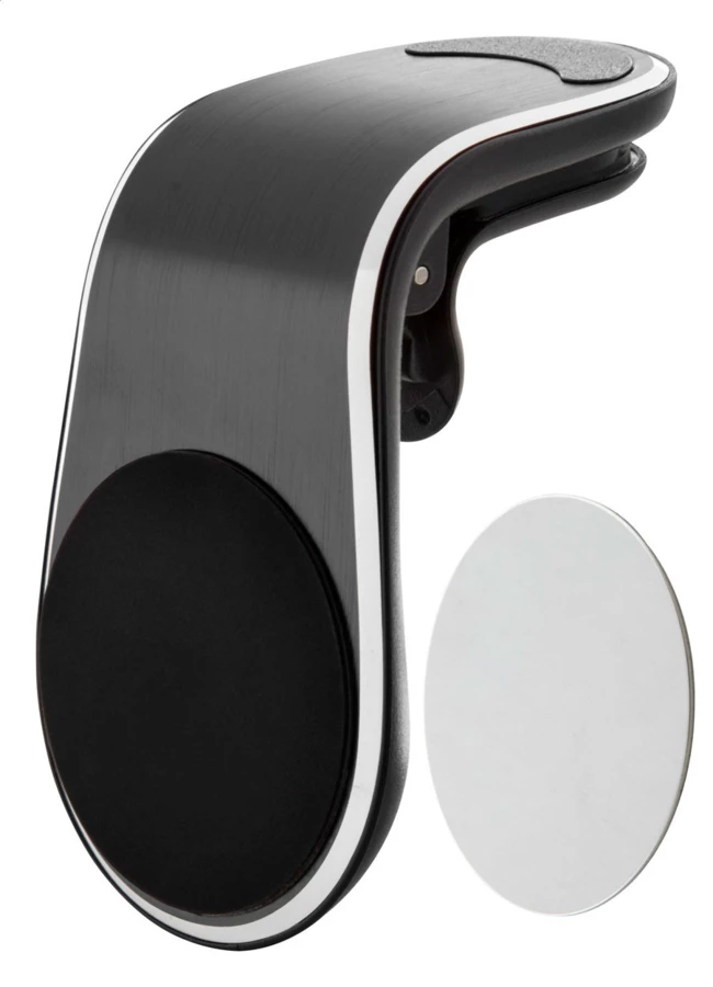 Aluminiowy, magnetyczny uchwyt samochodowy z mocowaniem na kratkę wentylacyjną. W zestawie samoprzylepna metalowa płytka.