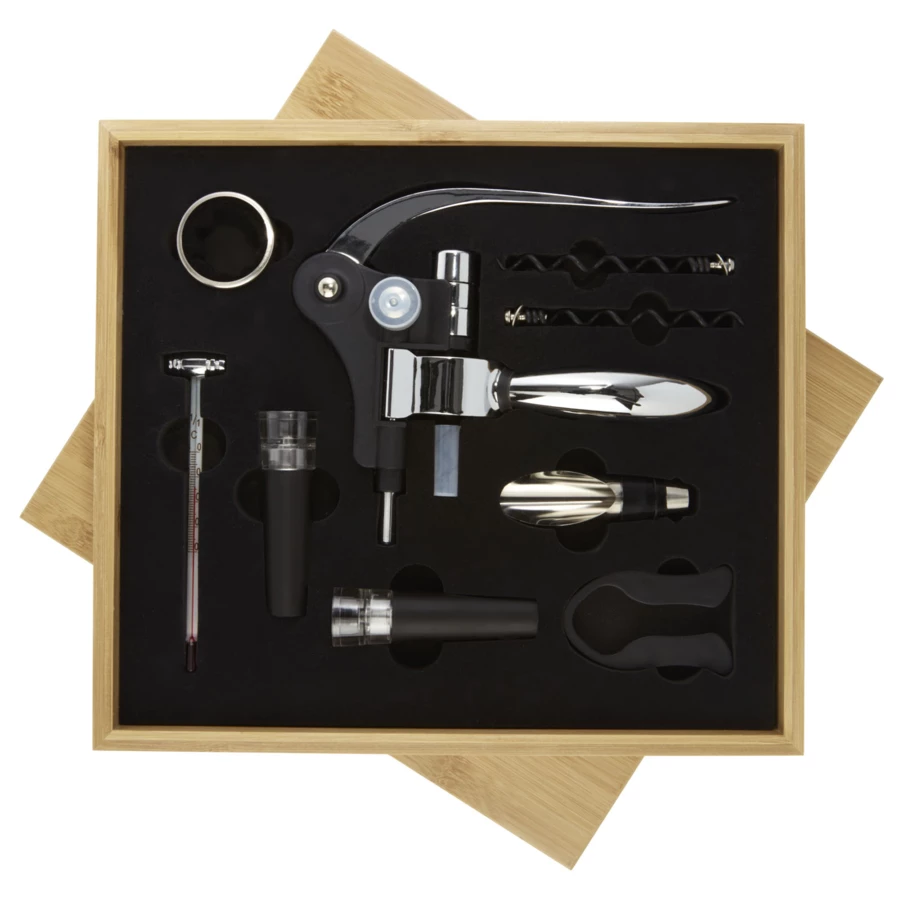 9-częściowy zestaw do wina zawierający 1 korkociąg, 2 zatyczki, 1 nalewak, 1 pierścień, 1 trymer do folii, 1 termometr i 2 zapasowe korkociągi. Dostarczane w bambusowym pudełku upominkowym, które zostało wyprodukowane zgodnie z zasadami zrównoważonego rozwoju.
