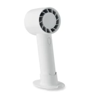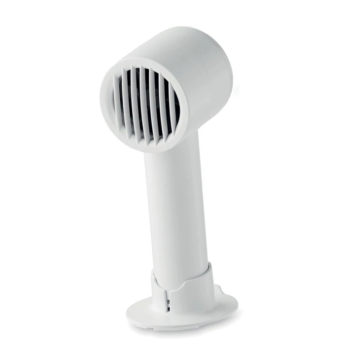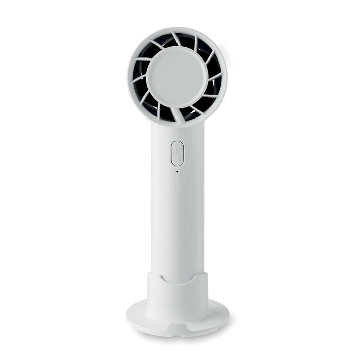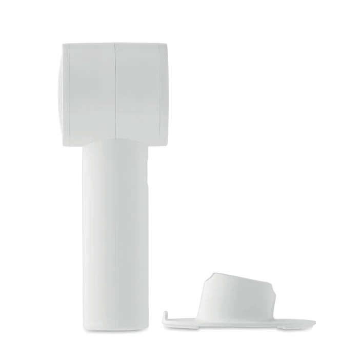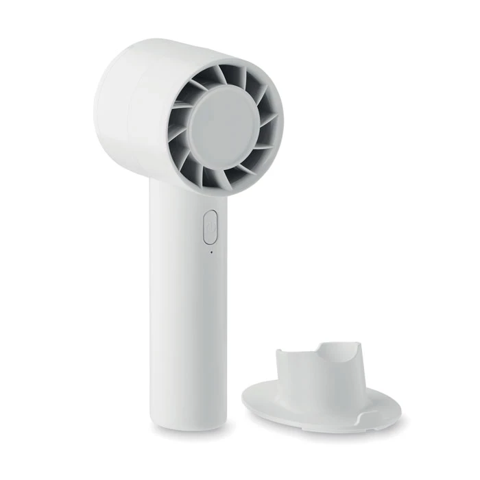 Mały przenośny wentylator z dodatkową podstawką na biurko z opcją podstawki na telefon. 3 ustawienia prędkości. Akumulator 2000 mAh ładowany przez port USB.