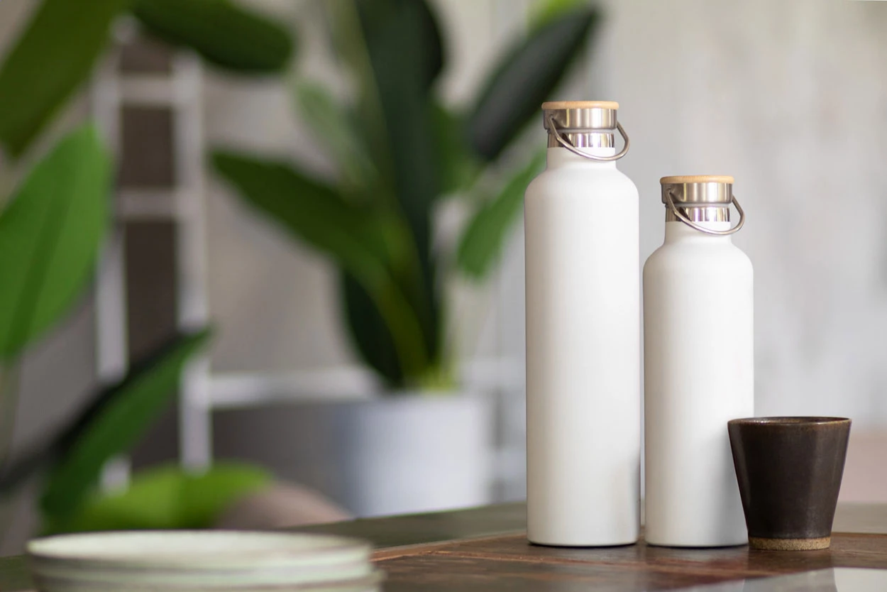 Butelka ze stali nierdzewnej o podwójnych ściankach z izolacją próżniową, z bambusową pokrywką. 1000 ml