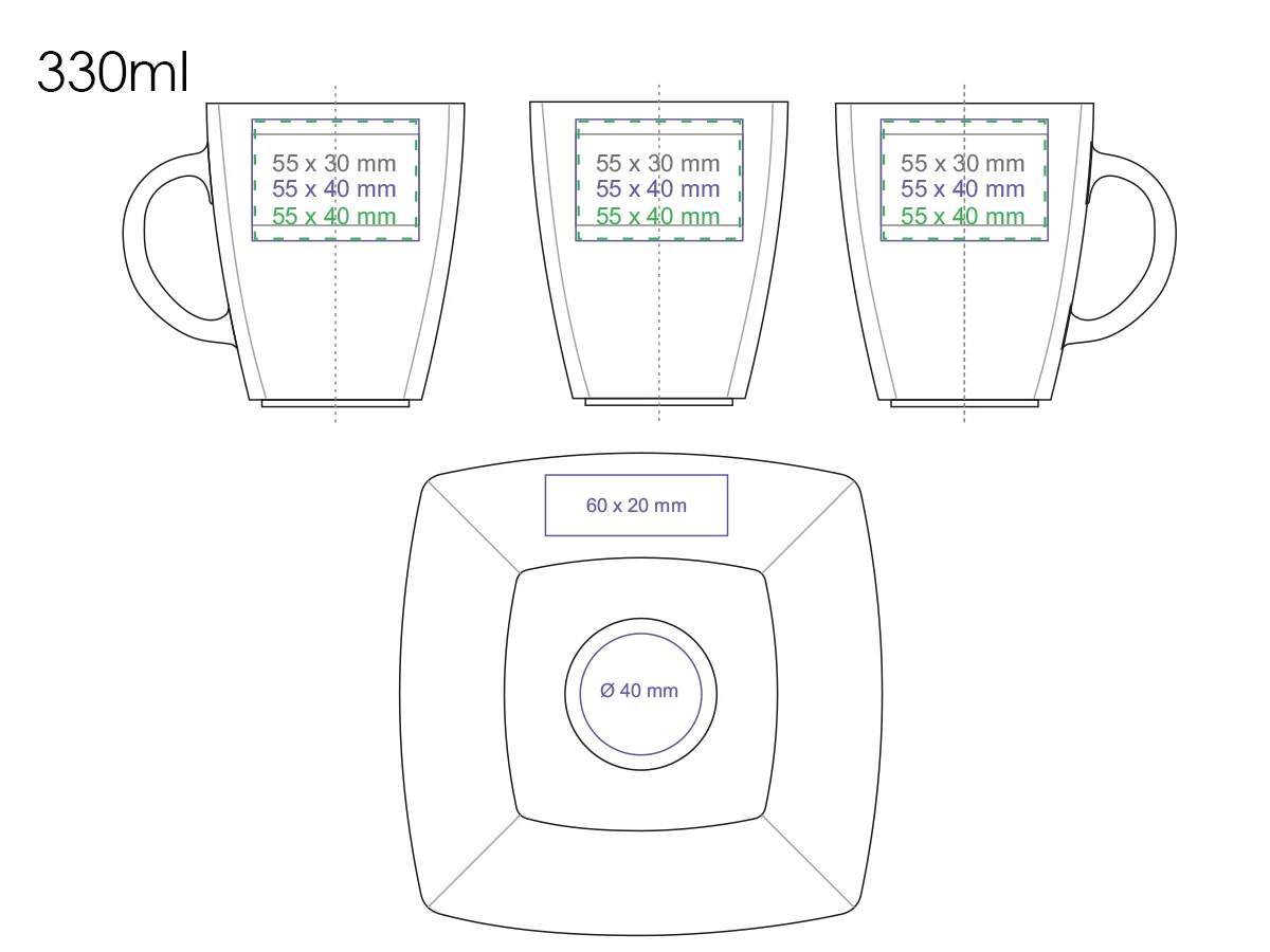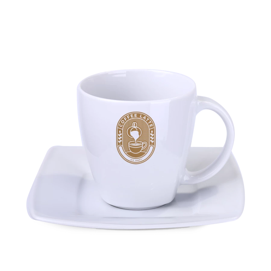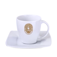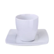 Porcelanowy set złożony z eleganckiego kubka oraz dedykowanego talerzyka. Cechą charakterystyczną tego fasonu są delikatne kwadratowe wykończenia widoczne w jego dolnej części.