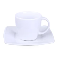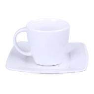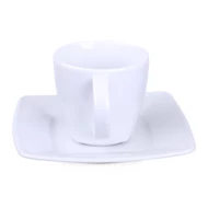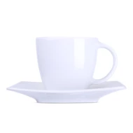 Elegancka porcelanowa filiżanka w zestawieniu z dedykowanym talerzykiem. Tym, co wyróżnia ten zestaw jest delikatne kwadratowe wykończenie widoczne dolnej części filiżanki.