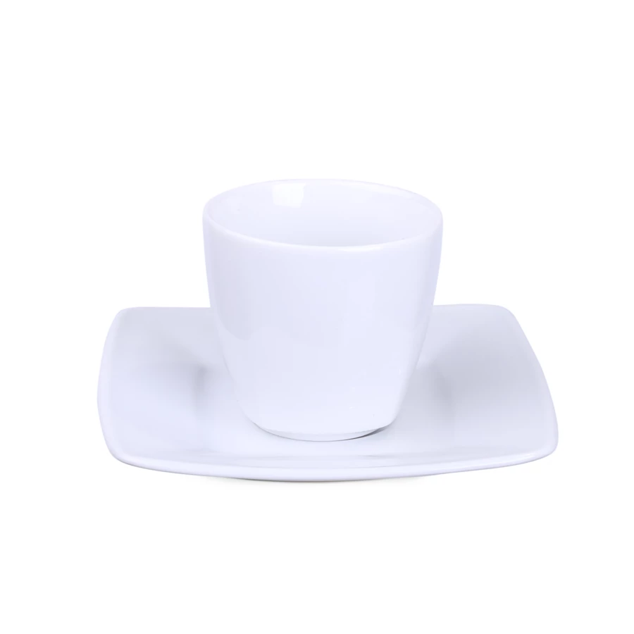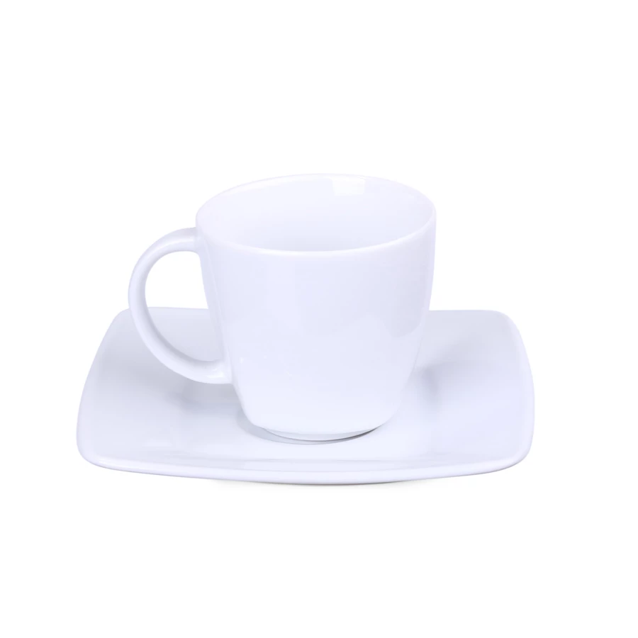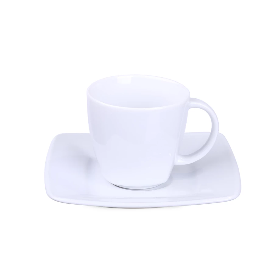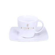 Elegancka porcelanowa filiżanka w zestawieniu z dedykowanym talerzykiem. Tym, co wyróżnia ten zestaw jest delikatne kwadratowe wykończenie widoczne dolnej części filiżanki.