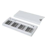 Zestaw precyzyjnych wkrętaków z 24 bitami w etui z recyklingowanego tworzywa ABS. Rękojeść wkrętaka wyposażona jest w magnetyczny uchwyt na bity, umożliwiający szybką i bezpieczną wymianę bitów.