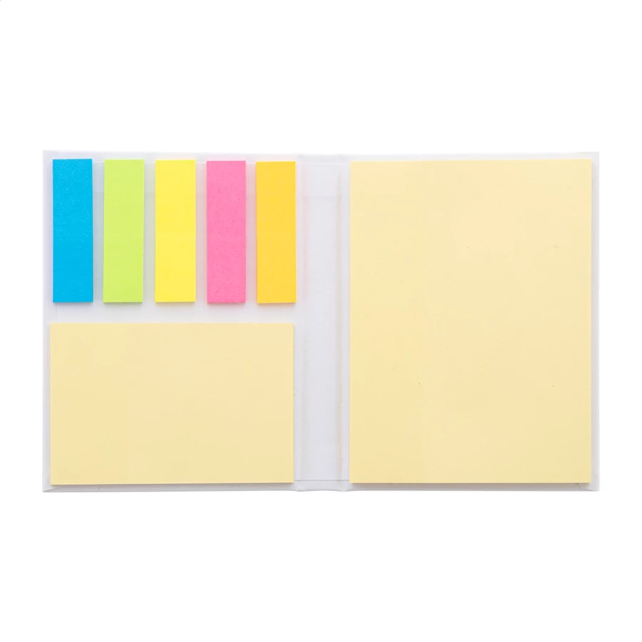Notatnik samoprzylepny z papieru pochodzącego z recyklingu, zawierający 50 dużych i 25 średnich żółtych karteczek oraz 125 zakładek (w 5 kolorach).