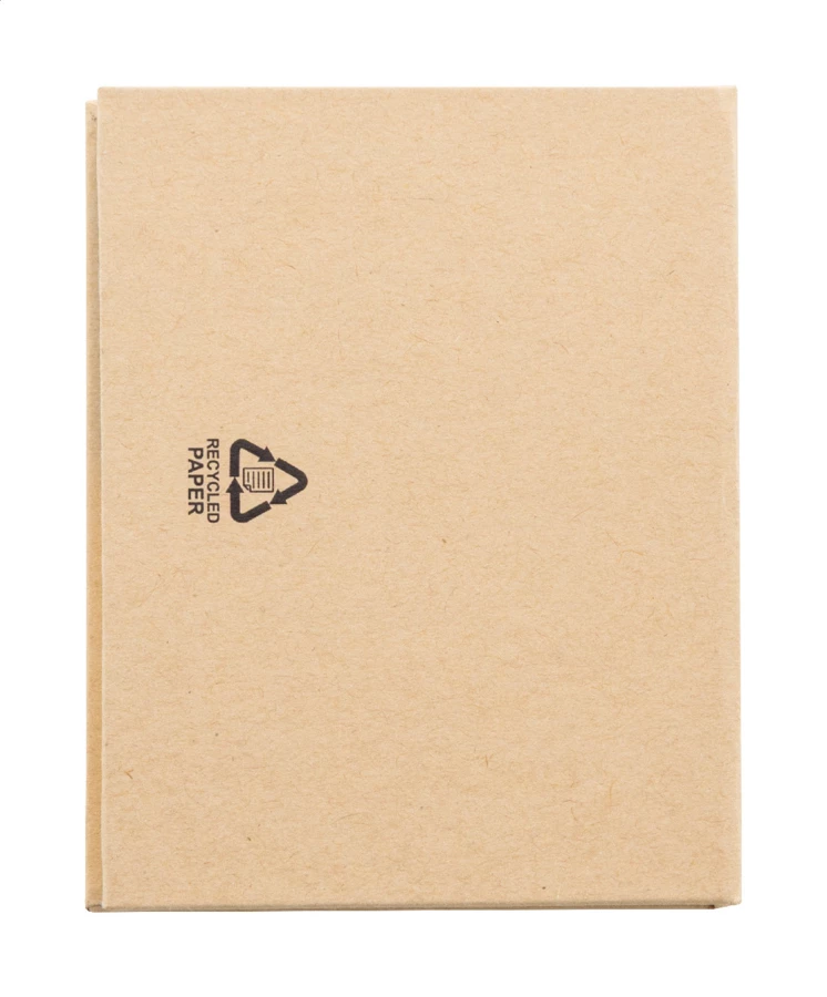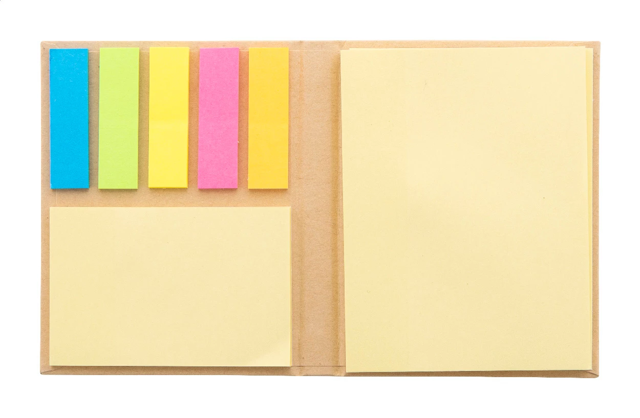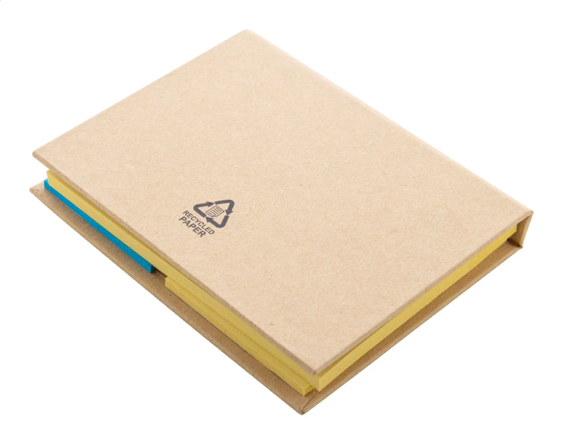 Notatnik samoprzylepny z papieru pochodzącego z recyklingu, zawierający 50 dużych i 25 średnich żółtych karteczek oraz 125 zakładek (w 5 kolorach).