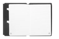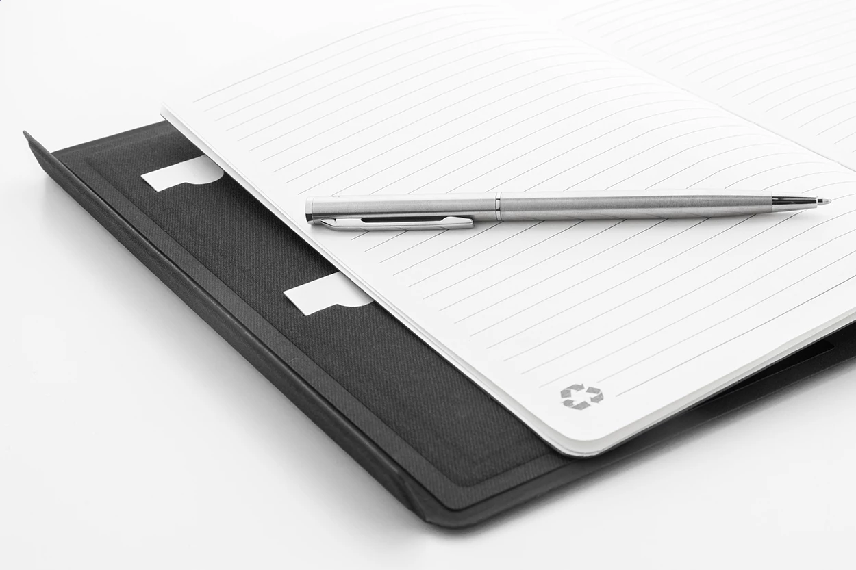 Teczka na dokumenty z recyklingowanej skóry PU w formacie A5 z wewnętrznymi kieszeniami organizacyjnymi i magnetycznym zamknięciem. Z 64-liniowanymi kartkami notatnika z papieru z recyklingu.