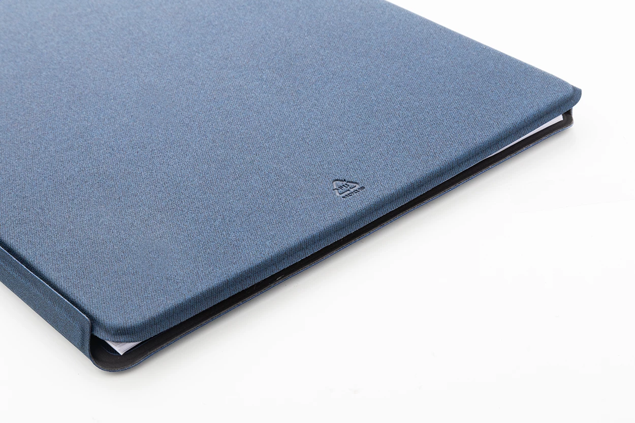 Teczka na dokumenty z recyklingowanej skóry PU w formacie A5 z wewnętrznymi kieszeniami organizacyjnymi i magnetycznym zamknięciem. Z 64-liniowanymi kartkami notatnika z papieru z recyklingu.