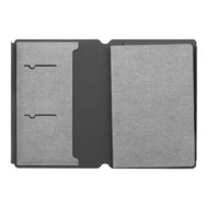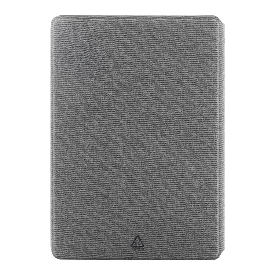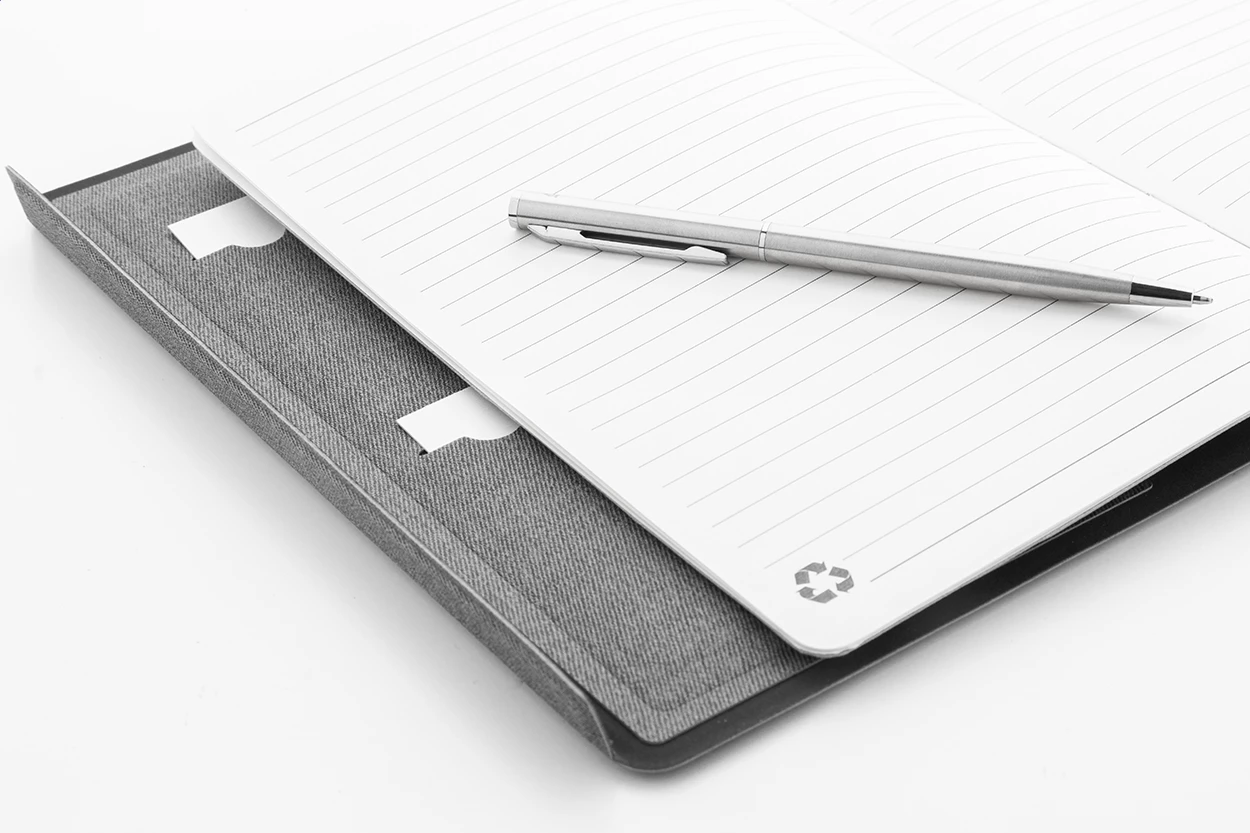 Teczka na dokumenty z recyklingowanej skóry PU w formacie A5 z wewnętrznymi kieszeniami organizacyjnymi i magnetycznym zamknięciem. Z 64-liniowanymi kartkami notatnika z papieru z recyklingu.